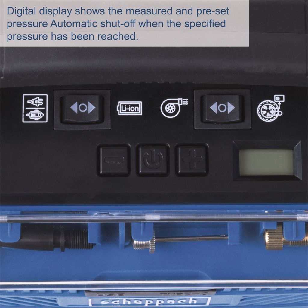 - Ez a hibrid kompresszor üzemeltethető Scheppach IXES 20 V sorozatú akkumulátorral, normál elektromos hálózatról (230 V) vagy autós szivargyújtóról (12 V).