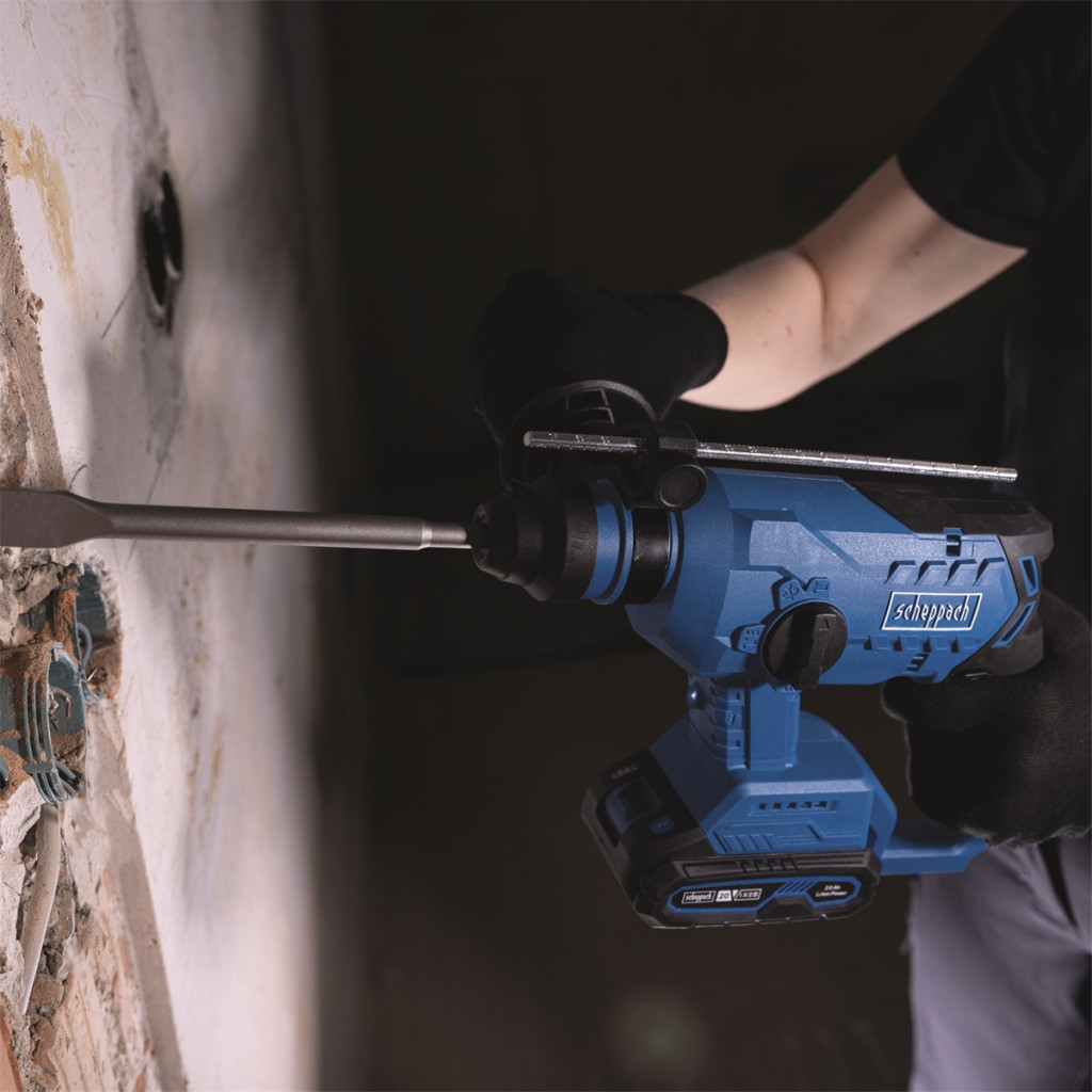 - A Scheppach BC-RHD230-X egy jól felszerelt, kompakt, többfunkciós akkus kalapács, amely tökéletes minden általános építési munkához, még ott is, ahol nincs áramellátás.