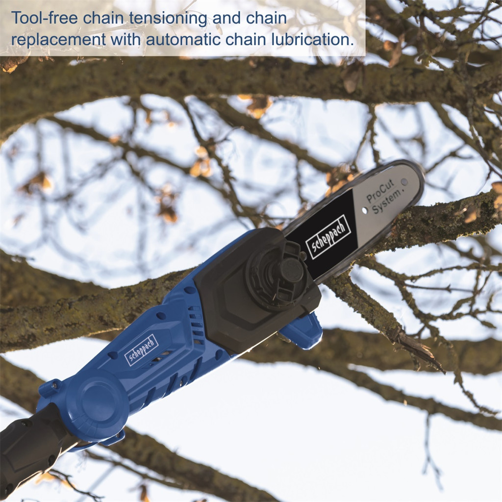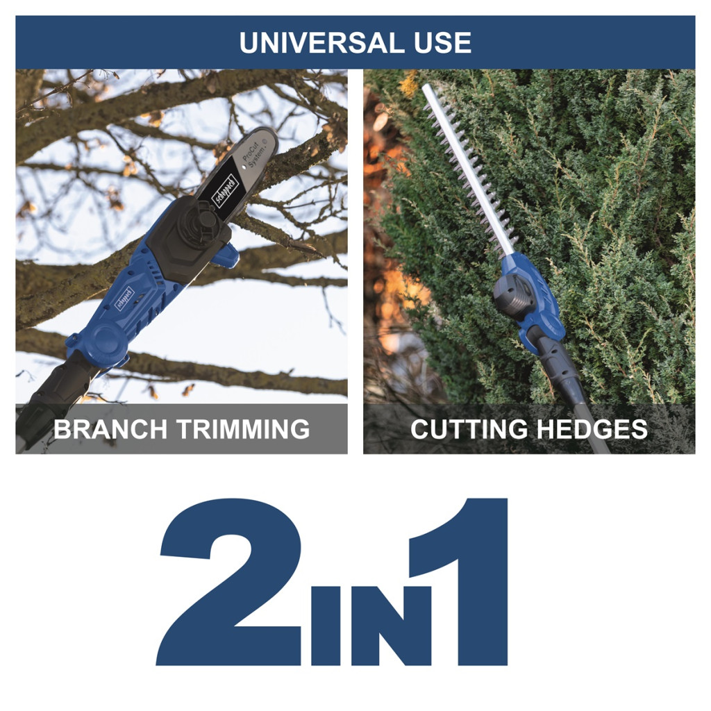 - A nagy teljesítményű Scheppach C-PHTS410-X vezeték nélküli többfunkciós készülék 2 az 1-ben funkcióval sövénynyírásra és ágak vágására szolgál, még nagyobb magasságban is.