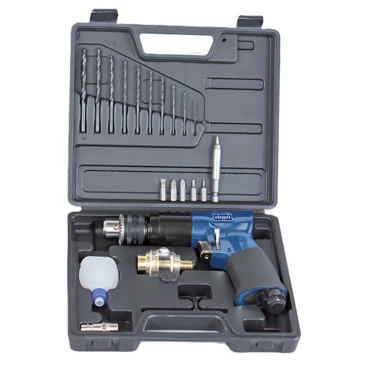 Pneumatikus fúrógép 3/8 " Csavarozókészlet és tartozékok praktikus kofferban Kompakt, könnyű, irányváltó -előre/hátramenet: igen Csúszásgátló markolat: igen Üzemi nyomás: 6,3 bar Levegőszükséglet: 141 l/perc Fordulatszám: 1800 fordulat/perc Fúró átmérő max.: 10 mm Tartozékok: 10 x HSS fúró, 6 x CrV bit fúró, 1 x bit tartó, zsírzógomb, olaj, tokmány, gyorscsatlakozó levegőolajozó