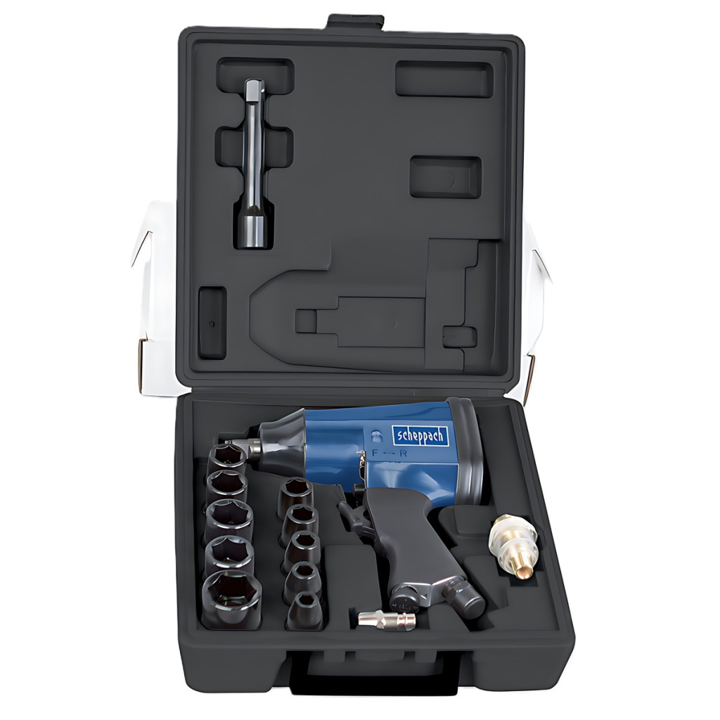 Pneumatikus légkulcs 1/2 " Pneumatikus légkulcskészlet praktikus kofferben Ideális menetes csavarok gyors ki és becsavarásához, kerékcserékhez, acél és fa konstrukciók rögzítéséhez Gyors rögzítés a 7000 fordulatszámnak/perc köszönhetően.