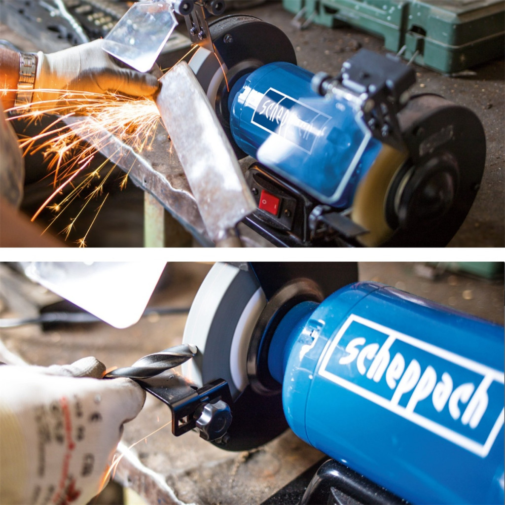 - A stabil és biztonságos működés érdekében öntöttvas talppal van felszerelve, amely szilárd rögzítési lehetőséggel, gumitalpakkal, korongvédő pajzsokkal és állítható munkadarab-támaszokkal, amelyek a korongok élettartamát is meghosszabbítják.