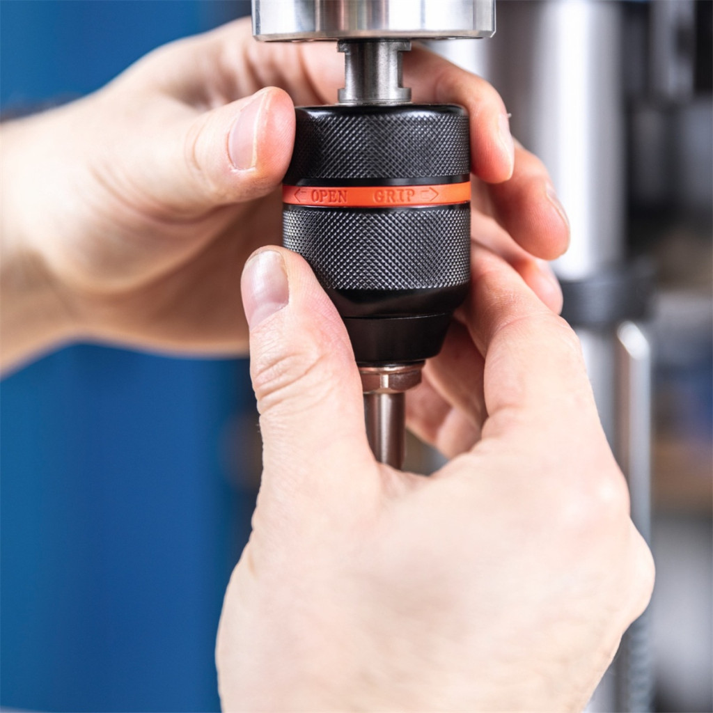- A csapágyas kulcs nélküli tokmány 1,5-13 mm átmérőjű fúrófejeket fogad, az állítható mélységütköző pedig sorozatfúrás során is állandó eredményt biztosít.