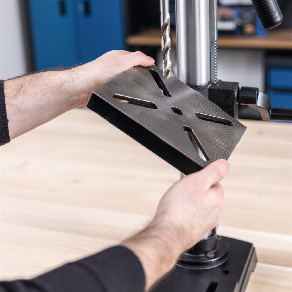 - A 198 × 194 mm-es munkaasztal 360°-ban elforgatható, magasságban állítható és ±45°-ig dönthető, ami kényelmes fúrást tesz lehetővé még összetettebb munkadarabok esetén is.