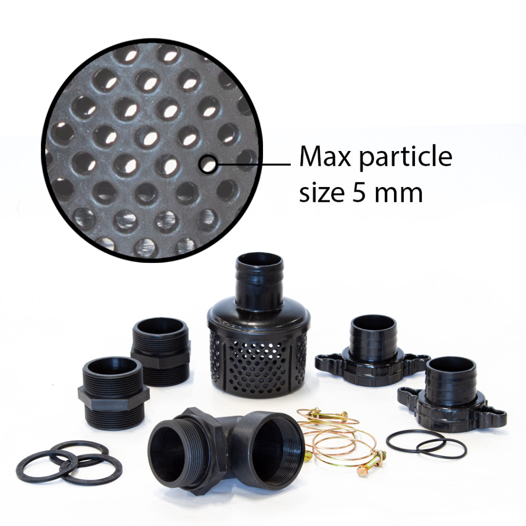 - Szívóoldal: 2” merevített szívótömlő + szívókosár (a kosár mindig legyen víz alatt)
